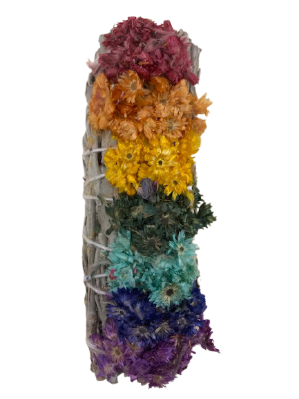 The 7 Chakra sage with Mullein flowers is the perfect smudge for clearing and aligning your energy fields internally and around your body. The 7 Chakra sage is used for : purification, protection, new beginnings, compassion, communication, healing, happiness, and commitment. These energy vortexes send vibrations into the spiritual realm affecting the: root, sacral, third eye, throat, heart, solar plexus, and crown chakras.