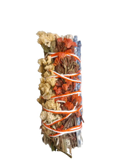 The Blue Sage smudge with Sinuata Blanca and Roja Sudan Azul flowers is used with a Wild Turkey Feather to smudge your body and home. When you are done, sit it inside of an Abalone Shell which sits on of your Wooden Tripod stand.
