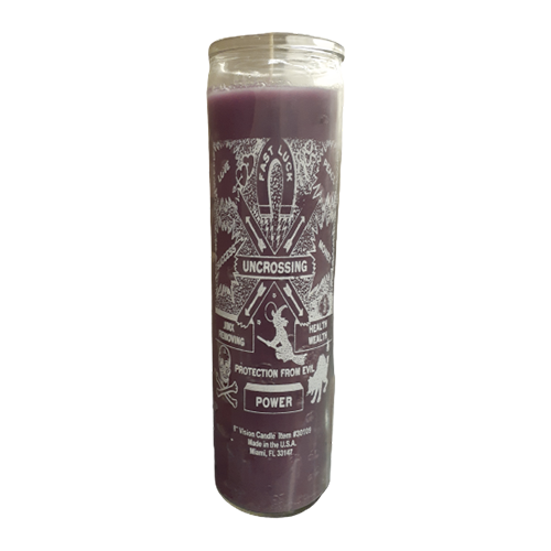 The Uncrossing candle is used to remove crossed conditions that may exist in your life due to: curses, hexes, jinxes, and any other negative energy that has attached itself to you. To begin working this uncrossing candle spell, you would first need to do an Egg Cleansing. After you have properly cleansed, take a spiritual bath in: salt, Hyssop, Cascarilla, and a third of a bottle of Destroy Everything bath and floor wash. While preparing this bath you can read Psalm 68. While you are bathing concentrate on the conditions that you want to remove from your life and what you want to draw in. Pray the 23rd Psalm and any other protective prayers while you are in the bath. Let the water pass over your head while you are in it.