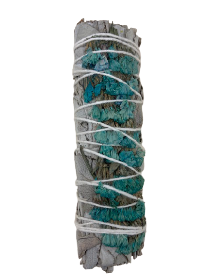 The White sage bundle with Blue Sinuata flowers can be used with a Wild Turkey Feather to smudge your body and home. When you are done, sit it inside of an Abalone Shell which sits on of your Wooden Tripod stand.
