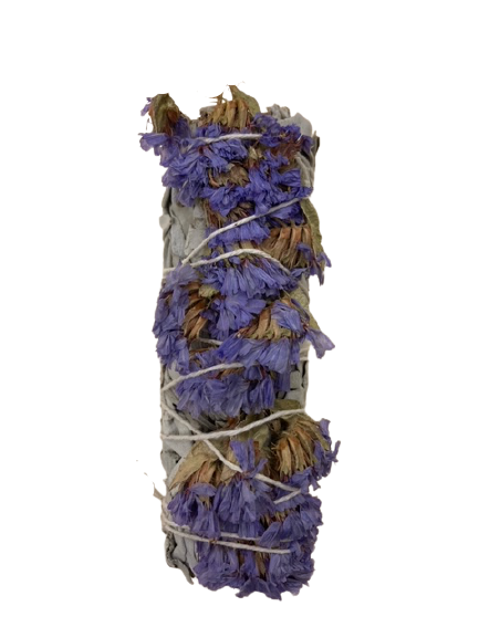 The White Sage stick with Purple Sinuata flowers can be used with a Wild Turkey Feather to smudge your body and home. When you are done, sit it inside of an Abalone Shell which sits on of your Wooden Tripod stand.